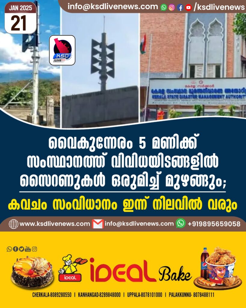 വൈകുന്നേരം 5 മണിക്ക് സംസ്ഥാനത്ത് വിവിധയിടങ്ങളില് സൈറണുകള് ഒരുമിച്ച് മുഴങ്ങും; കവചം സംവിധാനം ഇന്ന് നിലവില് വരും