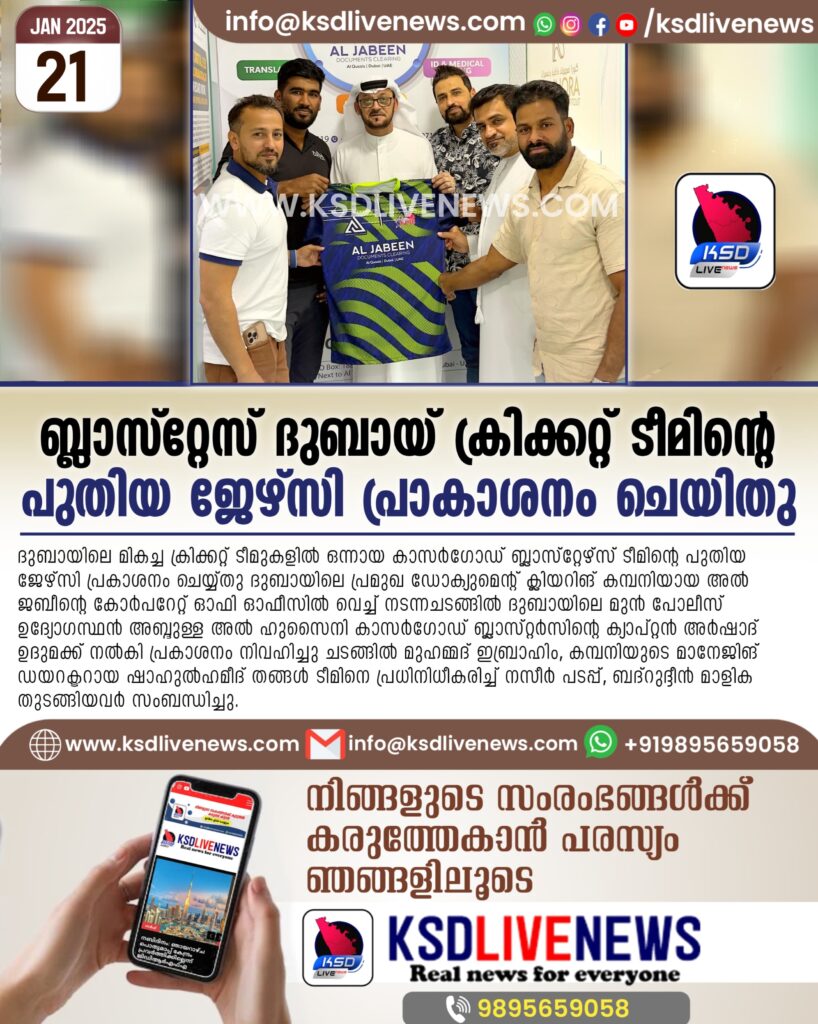 ദുബായ്: ദുബായിലെ മികച്ച ക്രിക്കറ്റ് ടീമുകളിൽ ഒന്നായ കാസർഗോഡ് ബ്ലാസ്റ്റേഴ്സ് ടീമിന്റെ പുതിയ ജേഴ്സി പ്രകാശനം ചെയ്യ്തു