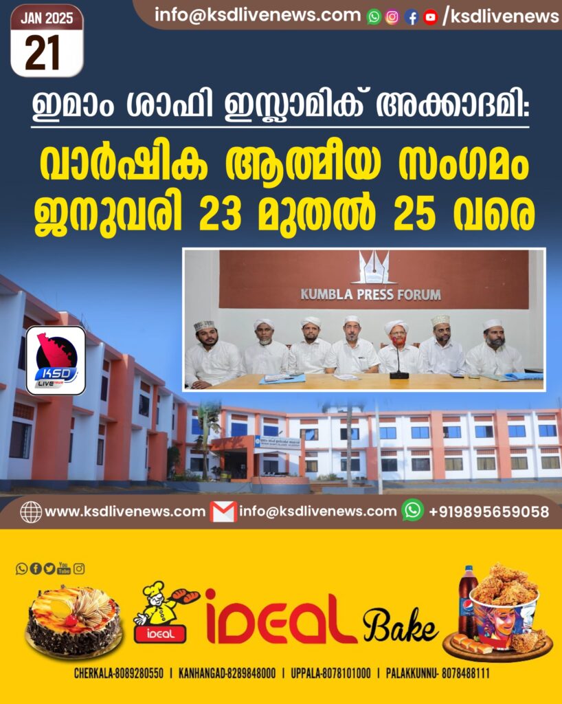 കുമ്പള: ഇമാം ശാഫി ഇസ് ലാമിക് അക്കാദമി,വാർഷിക ആത്മീയ സംഗമം (ജൽസ:സീറത്തു ഇമാം ശാഫി) ജനുവരി 23,24,25 തീയതികളിൽ അക്കാദമി കാംപസിൽ വിവിധങ്ങളായ പരിപാടികളോടെ നടക്കുമെന്ന് ഭാരവാഹികൾ വാർത്താ സമ്മേളനത്തിൽ അറിയിച്ചു. സിയാറത്ത്,പതാക ഉയർത്തൽ, ഖത്മുൽ ഖുർആൻ,ത്രെഡ് എക്സ്പോ, ഹോം കമിങ് മജ്ലിസുന്നൂർ,ഇശ്ഖ് മജ്ലിസ്, മഹല്ല് – പ്രാസ്ഥാനിക സംഗമം, ഇമാം ശാഫി മൗലീദ്, മത പ്രഭാഷണം, ഇത്തിസാൽ, സമാപന സംഗമം എന്നിവയാണ് പ്രധാന പരിപാടികൾ.