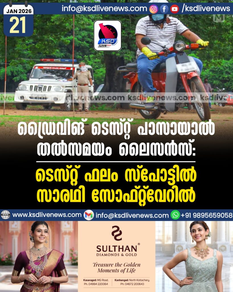 ഡ്രൈവിങ് ടെസ്റ്റ് പാസായാൽ തൽസമയം ലൈസൻസ്: ടെസ്റ്റ് ഫലം സ്പോട്ടിൽ സാരഥി സോഫ്റ്റ്വേറിൽ