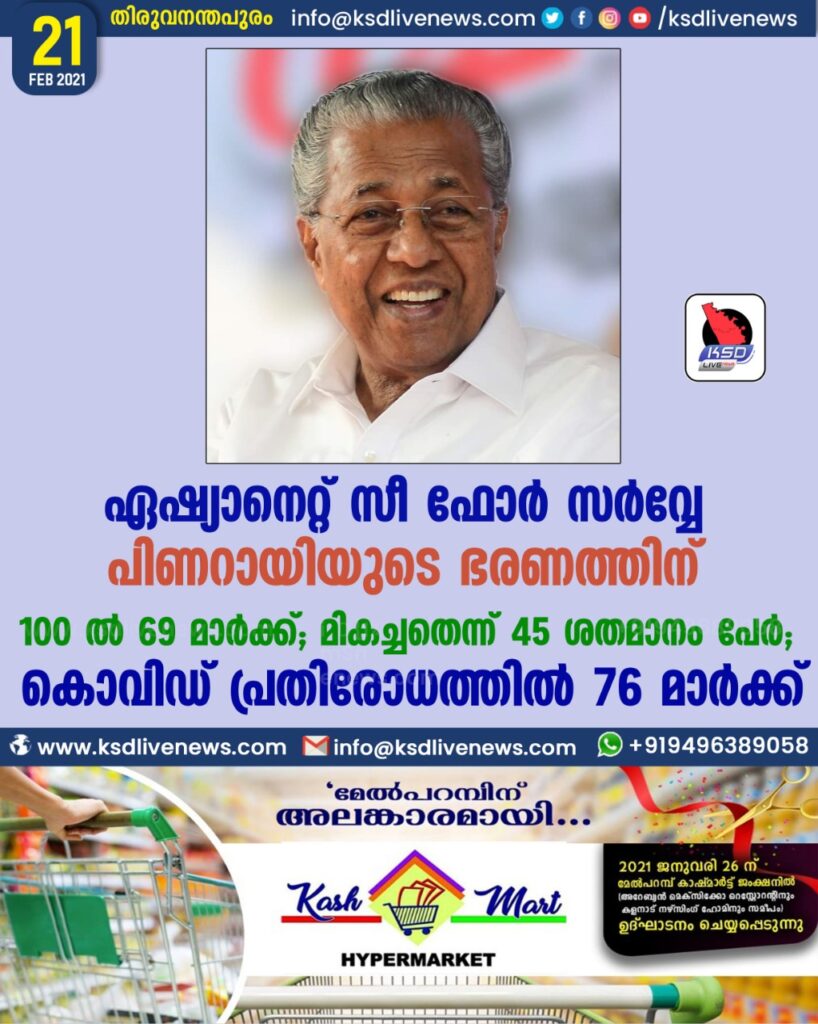 ഏഷ്യാനെറ്റ് സീ ഫോർ സർവ്വേ പിണറായിയുടെ ഭരണത്തിന് 100 ൽ 69 മാർക്ക് ; മികച്ചതെന്ന് 45 ശതമാനം പേർ ; കൊവിഡ് പ്രതിരോധത്തിൽ 76 മാർക്ക്