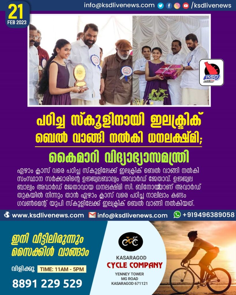 കാസർകോട്∙ ഏഴാം ക്ലാസ് വരെ പഠിച്ച സ്കൂളിലേക്ക് ഇലക്ട്രിക് ബെൽ വാങ്ങി നൽകി സംസ്ഥാന സർക്കാരിന്റെ ഉജ്ജ്വലബാല്യം അവാർഡ് ജേതാവ്. ഉജ്ജ്വല ബാല്യം അവാർഡ് ജേതാവായ ധനലക്ഷ്മി സി. ബിനോയ്യാണ് അവാർഡ് തുകയിൽ നിന്നും താൻ ഏഴാം ക്ലാസ് വരെ പഠിച്ച നാലിലാം കണ്ടം ഗവൺമെന്റ് യുപി സ്കൂളിലേക്ക് ഇലക്ട്രിക് ബെൽ വാങ്ങി നൽകിയത്.