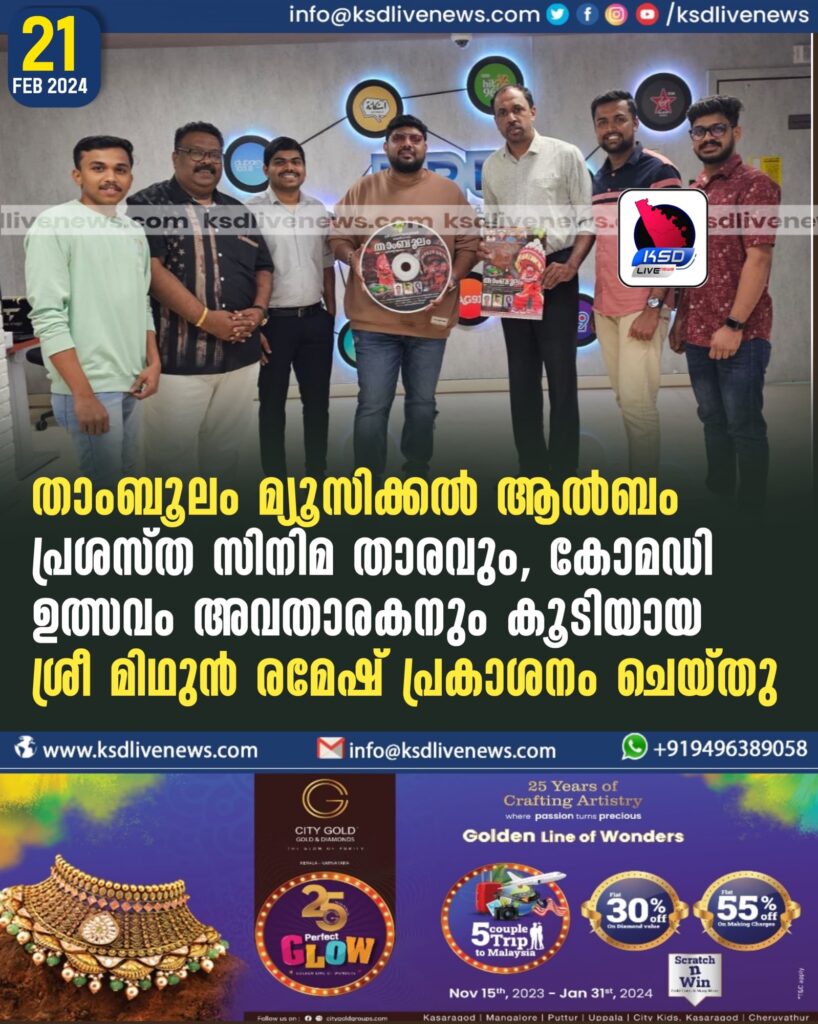 താംബൂലം മ്യൂസിക്കൽ ആൽബം പ്രശസ്ത സിനിമ താരവും, കോമഡി ഉത്സവം അവതാരകനും കൂടിയായ ശ്രീ മിഥുൻ രമേഷ് പ്രകാശനം ചെയ്തു