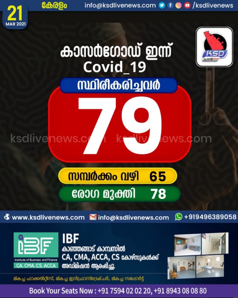 കാസർഗോഡ് ജില്ലയിൽ ഇന്ന് 79 പേർക്ക് കോവിഡ് സ്ഥിരീകരിച്ചു. സമ്പർക്കം വഴി 65 പേർക്കും. 78 പേർക്ക് രോഗമുക്തി