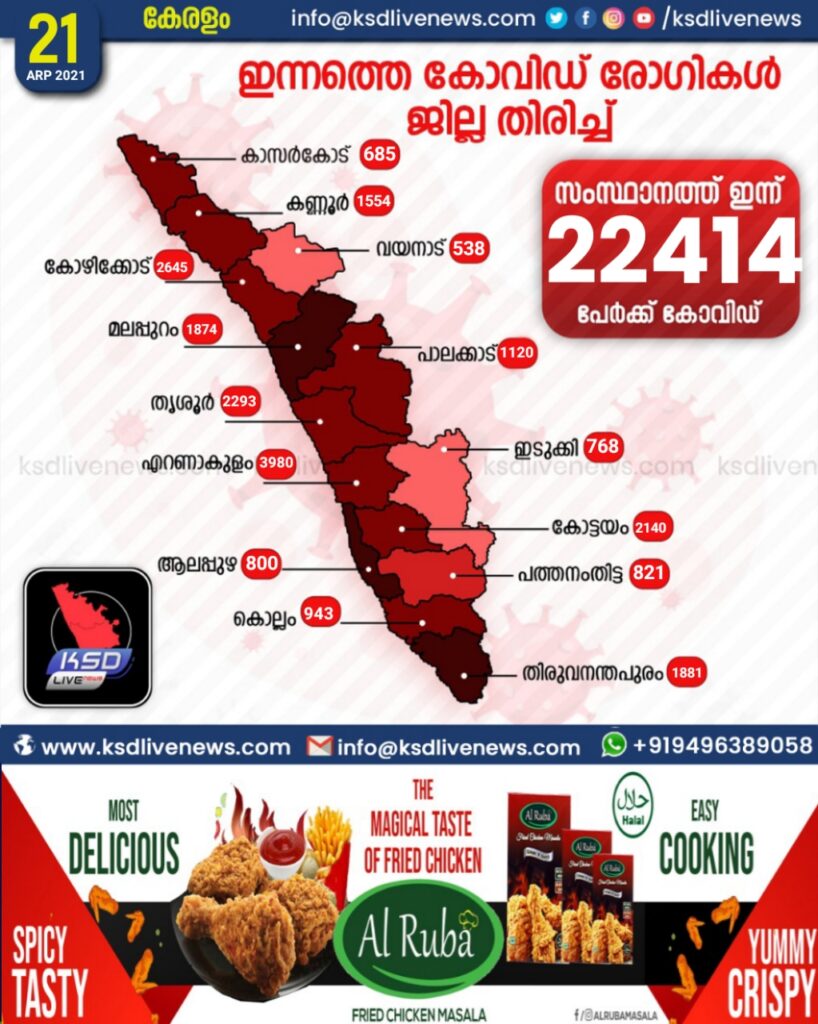 കേരളത്തില് ഇന്ന് 22,414 പേര്ക്ക് കോവിഡ്-19 സ്ഥിരീകരിച്ചു. എറണാകുളം 3980, കോഴിക്കോട് 2645, തൃശൂര് 2293, കോട്ടയം 2140, തിരുവനന്തപുരം 1881, മലപ്പുറം 1874, കണ്ണൂര് 1554, ആലപ്പുഴ 1172, പാലക്കാട് 1120, കൊല്ലം 943, പത്തനംതിട്ട 821, ഇടുക്കി 768, കാസര്ഗോഡ് 685, വയനാട് 538 എന്നിങ്ങനേയാണ് ജില്ലകളില് ഇന്ന് രോഗ ബാധ സ്ഥിരീകരിച്ചത്