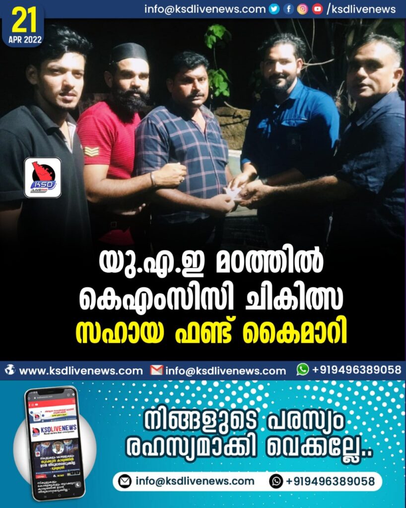 പള്ളിക്കര യു എ ഇ മഠത്തിൽ കെഎംസിസി ചികിത്സാ സഹായഫണ്ട് പള്ളിക്കര മഠത്തിൽ മുസ്ലിം ലീഗ് ശാഖ ജനറൽ സെക്രട്ടറി അബ്ബാസ് മഠത്തിലിന് മഠത്തിൽ കെ എം സി സി ജനറൽ സെക്രട്ടറി ഹാരിസ് കൈമാറി.ശാഖാ മുസ്ലിം ലീഗ് പ്രസിഡണ്ട് ഷറഫുദ്ദീൻ മഠത്തിൽ, മുസ്ലിം യൂത്ത് ലീഗ് പ്രസിഡന്റ് നൗഷാദ് ബി കെ,ജനറൽ സെക്രട്ടറി സെമിർ മൊയ്തു,ട്രഷറർ മുസ്തഖ്,വൈസ് പ്രസിഡന്റ് റൗഫ്, ഇബ്രാഹിം നാസർ അറബി, അഷ്റഫ് മഠത്തിൽ സംബന്ധിച്ചു.