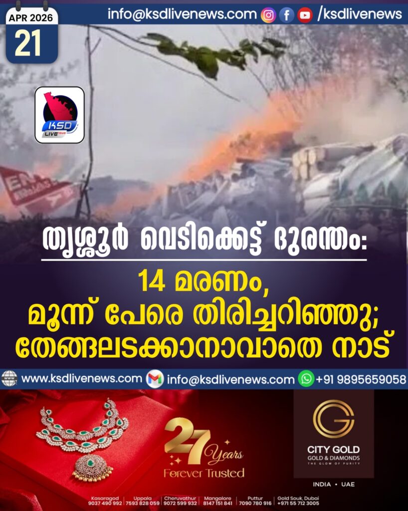 തൃശ്ശൂർ വെടിക്കെട്ട് ദുരന്തം: 14 മരണം, മൂന്ന് പേരെ തിരിച്ചറിഞ്ഞു; തേങ്ങലടക്കാനാവാതെ നാട്
