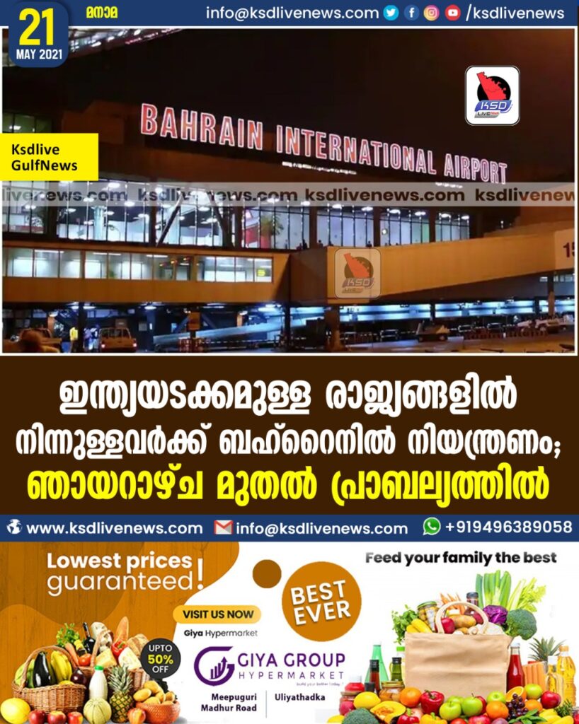 ഇന്ത്യയടക്കമുള്ള രാജ്യങ്ങളില് നിന്നുള്ളവര്ക്ക് ബഹ്റൈനില് നിയന്ത്രണം; ഞായറാഴ്ച മുതല് പ്രാബല്യത്തില്