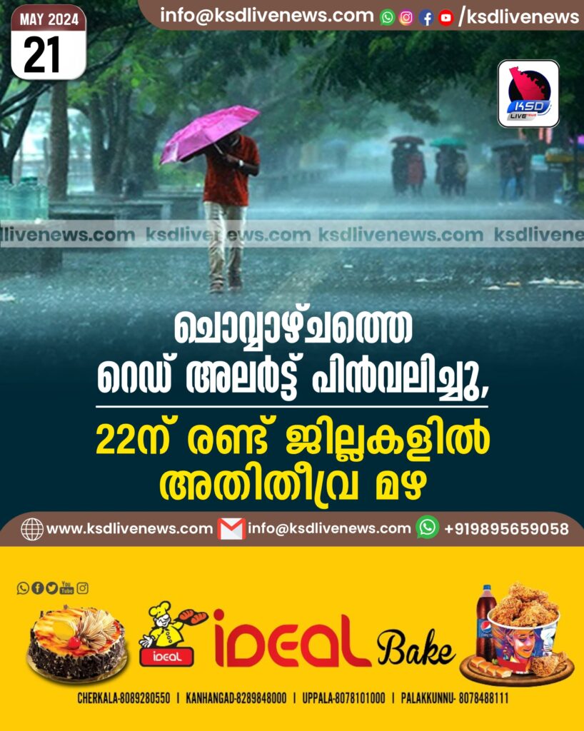 ചൊവ്വാഴ്ചത്തെ റെഡ് അലർട്ട് പിൻവലിച്ചു, 22-ന് രണ്ട് ജില്ലകളിൽ അതിതീവ്ര മഴ