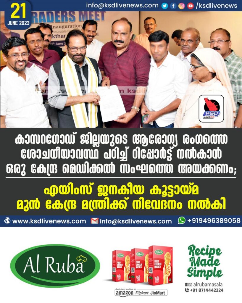 കാസറഗോഡ് ജില്ലയുടെ ആരോഗ്യ രംഗത്തെ ശോചനീയാവസ്ഥ പഠിച്ച് റിപ്പോർട്ട് നൽകാൻ ഒരു കേന്ദ്ര മെഡിക്കൽ സംഘത്തെ അയക്കണം: എയിംസ് ജനകീയ കൂട്ടായ്മ മുൻ കേന്ദ്ര മന്ത്രിക്ക് നിവേദനം നൽകി