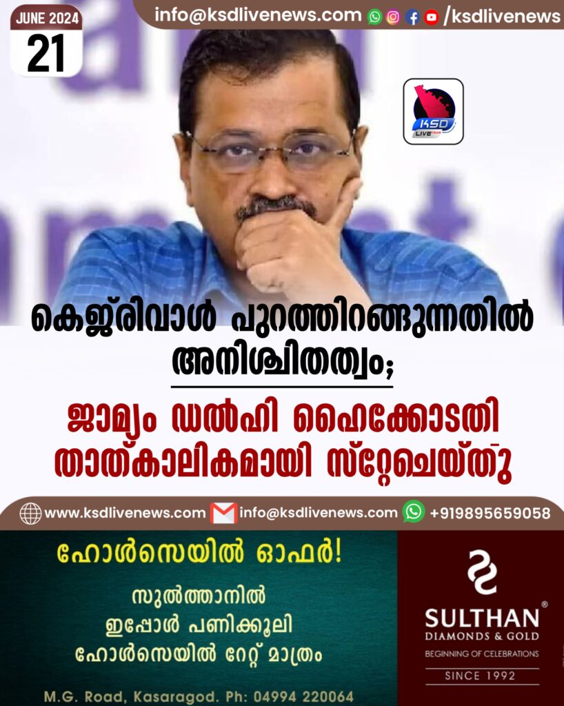 കെജ്രിവാള് പുറത്തിറങ്ങുന്നതില് അനിശ്ചിതത്വം; ജാമ്യം ഡല്ഹി ഹൈക്കോടതി താത്കാലികമായി സ്റ്റേചെയ്തു