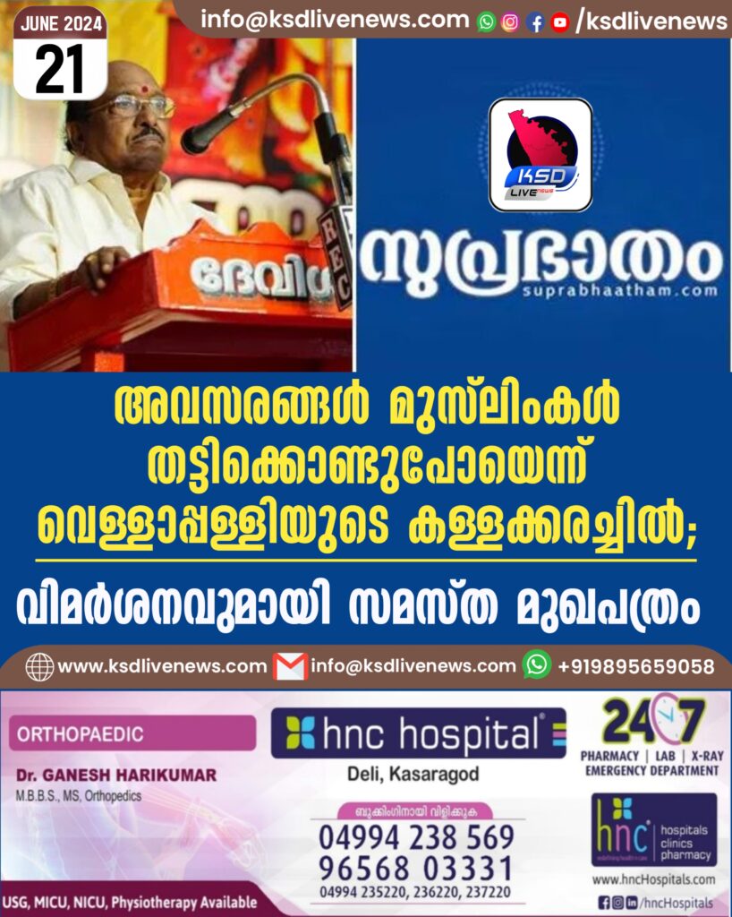 അവസരങ്ങള് മുസ്ലിംകള് തട്ടിക്കൊണ്ടുപോയെന്ന് വെള്ളാപ്പള്ളിയുടെ കള്ളക്കരച്ചില്’: വിമർശനവുമായി സമസ്ത