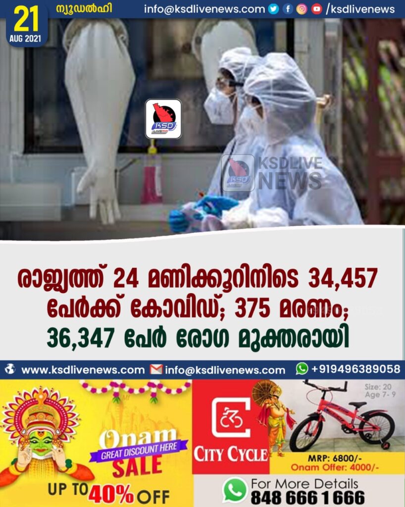 രാജ്യത്ത് 24 മണിക്കൂറിനിടെ 34,457 പേർക്ക് കോവിഡ്; 375 മരണം ; 36,347 പേർ രോഗ മുക്തരായി