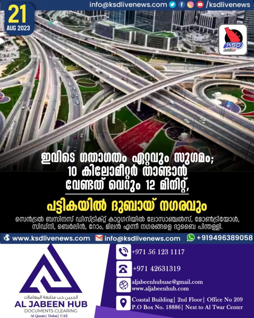 ഇവിടെ ഗതാഗതം ഏറ്റവും സുഗമം; 10 കിലോമീറ്റര് താണ്ടാന് വേണ്ടത് വെറും 12 മിനിറ്റ്, പട്ടികയില് ദുബായ് നഗരവും