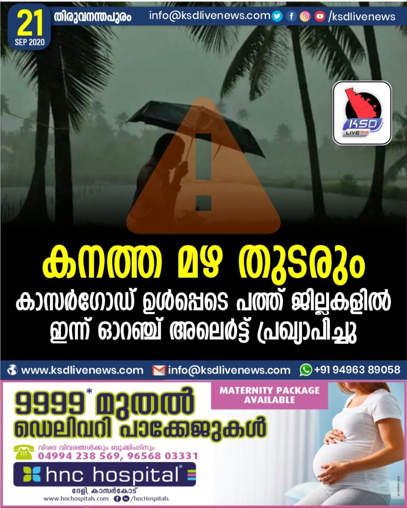 കാസർഗോഡ് ഉൾപ്പെടെ പത്ത് ജില്ലകളിൽ ഇന്ന് ഓറഞ്ച് അലെർട്ട് പ്രഖ്യാപിച്ചു