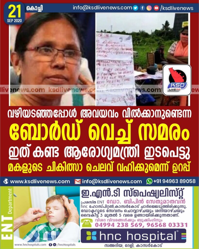 വഴിയടഞ്ഞപ്പോൾ അവയവം വിൽക്കാനുണ്ടെന്ന ബോർഡ് വെച്ച് സമരം ; ഇത് കണ്ട ആരോഗ്യമന്ത്രി ഇടപെട്ടു , മകളുടെ ചികിത്സാ ചെലവ് വഹിക്കുമെന്ന് ഉറപ്പ്