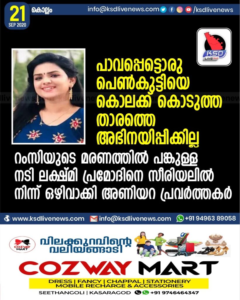 പാവപ്പെട്ടൊരു പെൺകുട്ടിയെ കൊലക്ക് കൊടുത്ത താരത്തെ അഭിനയിപ്പിക്കില്ല ; റംസിയുടെ മരണത്തിൽ പങ്കുള്ള നടി ലക്ഷ്മി പ്രമോദിനെ സീരിയലിൽ നിന്ന് ഒഴിവാക്കി അണിയറ പ്രവർത്തകർ