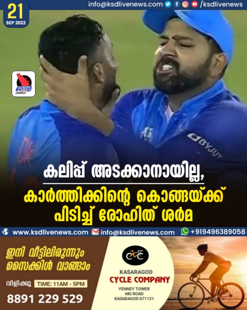 ഓസ്ട്രേലിയക്കെതിരായ ഒന്നാം ട്വന്റി 20 മത്സരത്തിനിടെ ഇന്ത്യന് നായകന് രോഹിത് ശര്മ സഹതാരം ദിനേശ് കാര്ത്തിക്കിന്റെ കഴുത്തില് പിടിക്കുന്ന വീഡിയോ സോഷ്യല് മീഡിയയില് വൈറലാകുന്നു. കലിപ്പ് അടക്കാനാകാതെ സമനില തെറ്റിയാണ് രോഹിത് ഇങ്ങനെ ചെയ്തത്. ഓസ്ട്രേലിയ ബാറ്റ് ചെയ്യുമ്ബോഴായിരുന്നു സംഭവം.