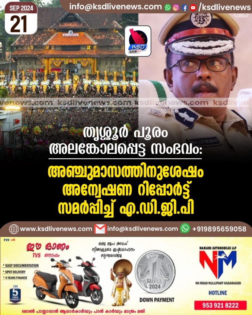 തൃശ്ശൂർ പൂരം അലങ്കോലപ്പെട്ട സംഭവം: അഞ്ചുമാസത്തിനുശേഷം അന്വേഷണ റിപ്പോർട്ട് സമർപ്പിച്ച് എ.ഡി.ജി.പി