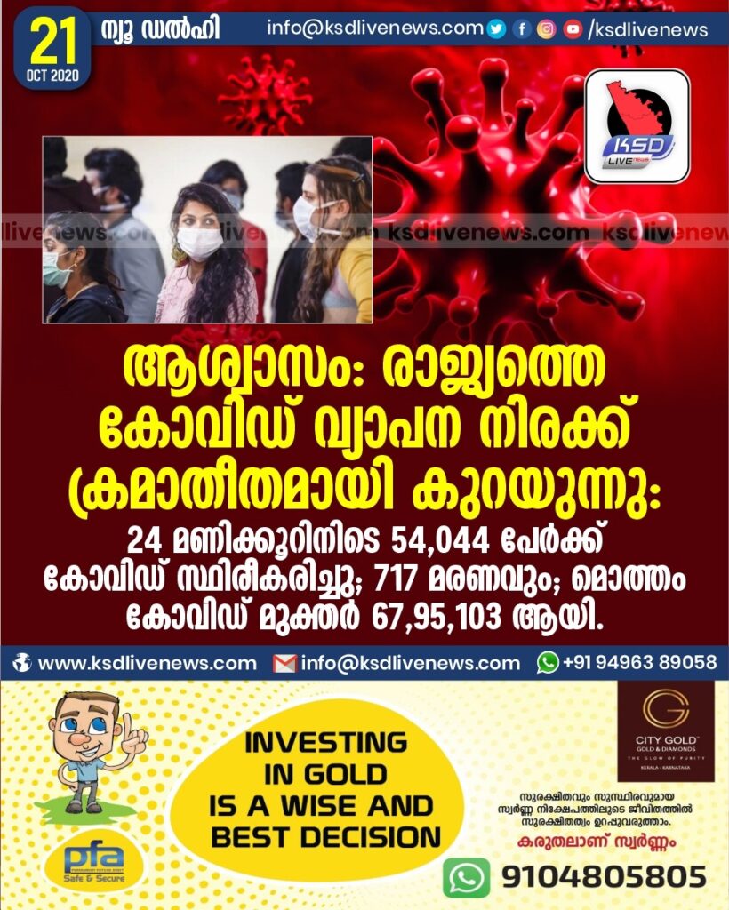 24 മണിക്കൂറിനിടെ 54,044 പേർക്ക് കോവിഡ് സ്ഥിരീകരിച്ചു ; 717 മരണവും ; മൊത്തം കോവിഡ് മുക്തർ 67,95,103 ആയി.
