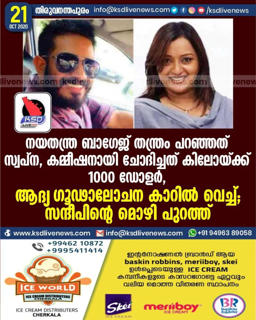 നയതന്ത്ര ബാഗേജ് തന്ത്രം പറഞ്ഞത് സ്വപ്ന , കമ്മീഷനായി ചോദിച്ചത് കിലോയ്ക്ക് 1000 ഡോളർ , ആദ്യ ഗൂഢാലോചന കാറിൽ വെച്ച് ; സന്ദീപിന്റെ മൊഴി പുറത്ത്