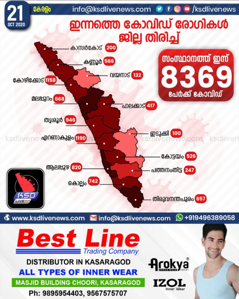 ഇന്ന് 8369 പേര്‍ക്ക് കോവിഡ്-19 സ്ഥിരീകരിച്ചു. എറണാകുളം 1190, കോഴിക്കോട് 1158, തൃശൂര്‍ 946, ആലപ്പുഴ 820, കൊല്ലം 742, മലപ്പുറം 668, തിരുവനന്തപുരം 657, കണ്ണൂര്‍ 566, കോട്ടയം 526, പാലക്കാട് 417, പത്തനംതിട്ട 247, കാസര്‍ഗോഡ് 200, വയനാട് 132, ഇടുക്കി 100
