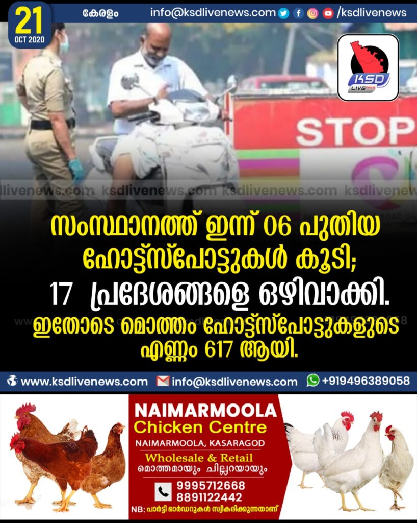 സംസ്ഥാനത്ത് ഇന്ന് 06 പുതിയ ഹോട്ട്സ്പോട്ടുകള്‍ കൂടി; 17 പ്രദേശങ്ങളെ ഒഴിവാക്കി.ഇതോടെ മൊത്തം ഹോട്ട്‌സ്‌പോട്ടുകളുടെ എണ്ണം 617 ആയി.
