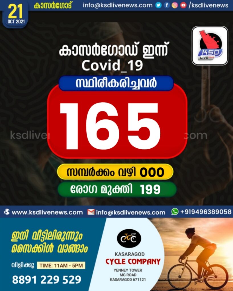കാസര്‍കോട് 165 ജില്ലയിൽ പേര്‍ കൂടി കോവിഡ് 19 പോസിറ്റീവായി. ചികിത്സയിലുണ്ടായിരുന്ന 211