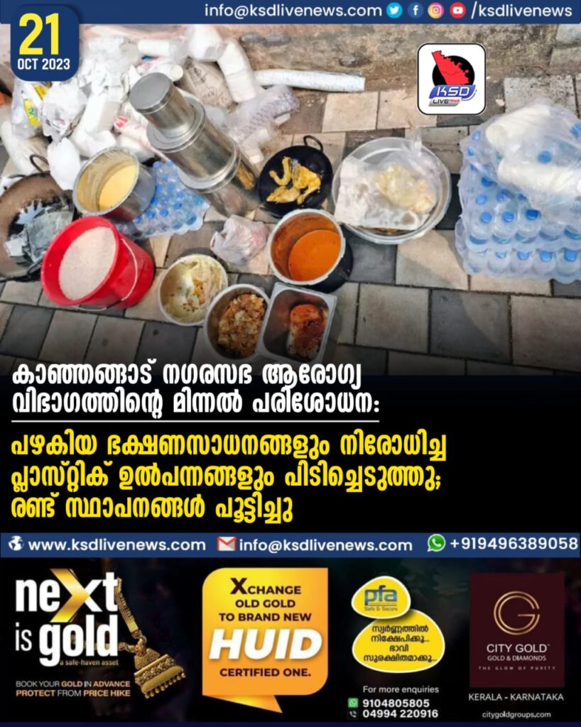 കാഞ്ഞങ്ങാട് നഗരസഭ ആരോഗ്യ വിഭാഗത്തിന്റെ മിന്നൽ പരിശോധന: പഴകിയ ഭക്ഷണസാധനങ്ങളും നിരോധിച്ച പ്ലാസ്റ്റിക് ഉൽപന്നങ്ങളും പിടിച്ചെടുത്തു; രണ്ട് സ്ഥാപനങ്ങൾ പൂട്ടിച്ചു