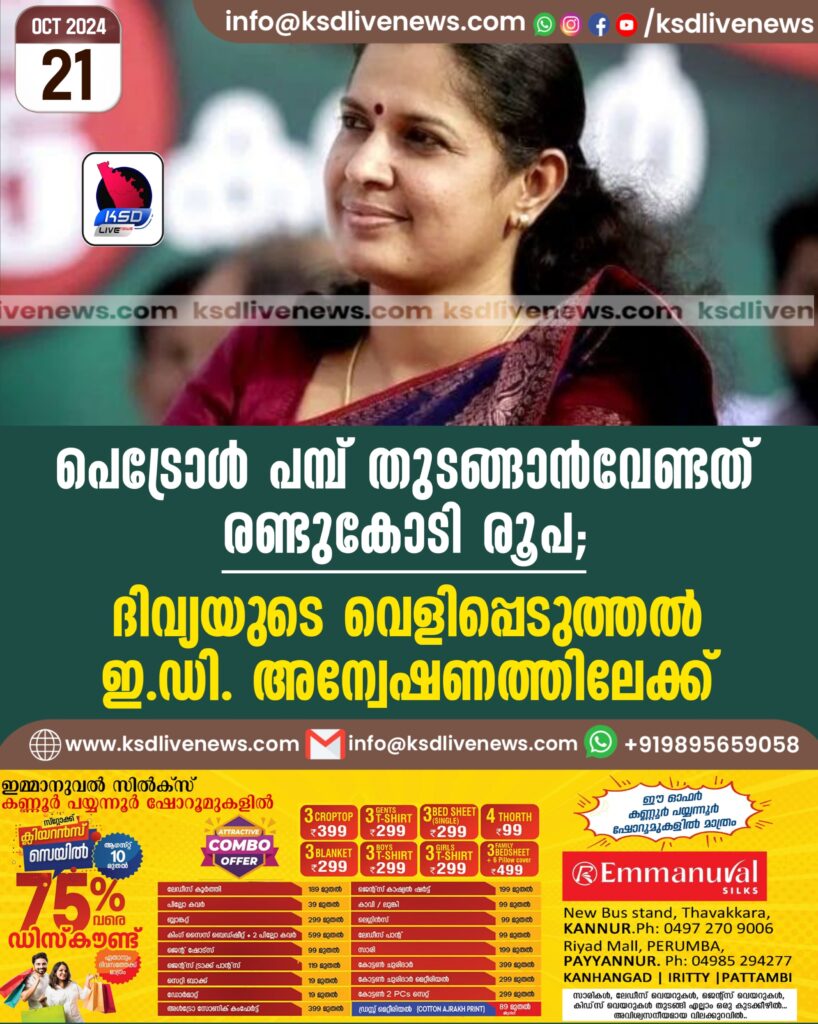പെട്രോള് പമ്പ് തുടങ്ങാന്വേണ്ടത് രണ്ടുകോടി രൂപ; ദിവ്യയുടെ വെളിപ്പെടുത്തല് ഇ.ഡി. അന്വേഷണത്തിലേക്ക്