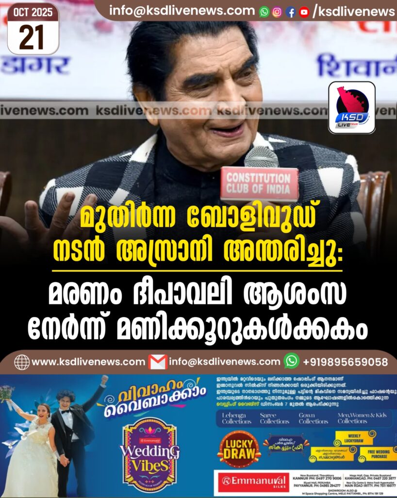 മുതിര്ന്ന ബോളിവുഡ് നടന് അസ്രാനി അന്തരിച്ചു: മരണം ദീപാവലി ആശംസ നേര്ന്ന് മണിക്കൂറുകള്ക്കകം