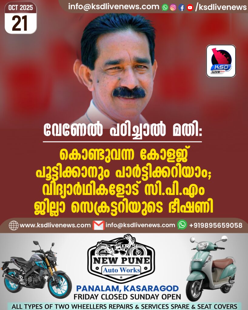 വേണേൽ പഠിച്ചാൽ മതി: കൊണ്ടുവന്ന കോളജ് പൂട്ടിക്കാനും പാർട്ടിക്കറിയാം; വിദ്യാർഥികളോട് സിപിഎം ജില്ലാ സെക്രട്ടറിയുടെ ഭീഷണി