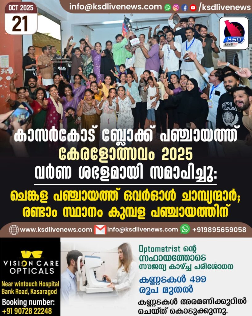 കാസർകോട് ബ്ലോക്ക് പഞ്ചായത്ത് “കേരളോത്സവം 2025″വർണ ശഭളമായി സമാപിച്ചു. ചെങ്കള പഞ്ചായത്ത് ഒവർഓൾ ചാമ്പ്യന്മാർ, രണ്ടാം സ്ഥാനം കുമ്പള പഞ്ചായത്തിന്