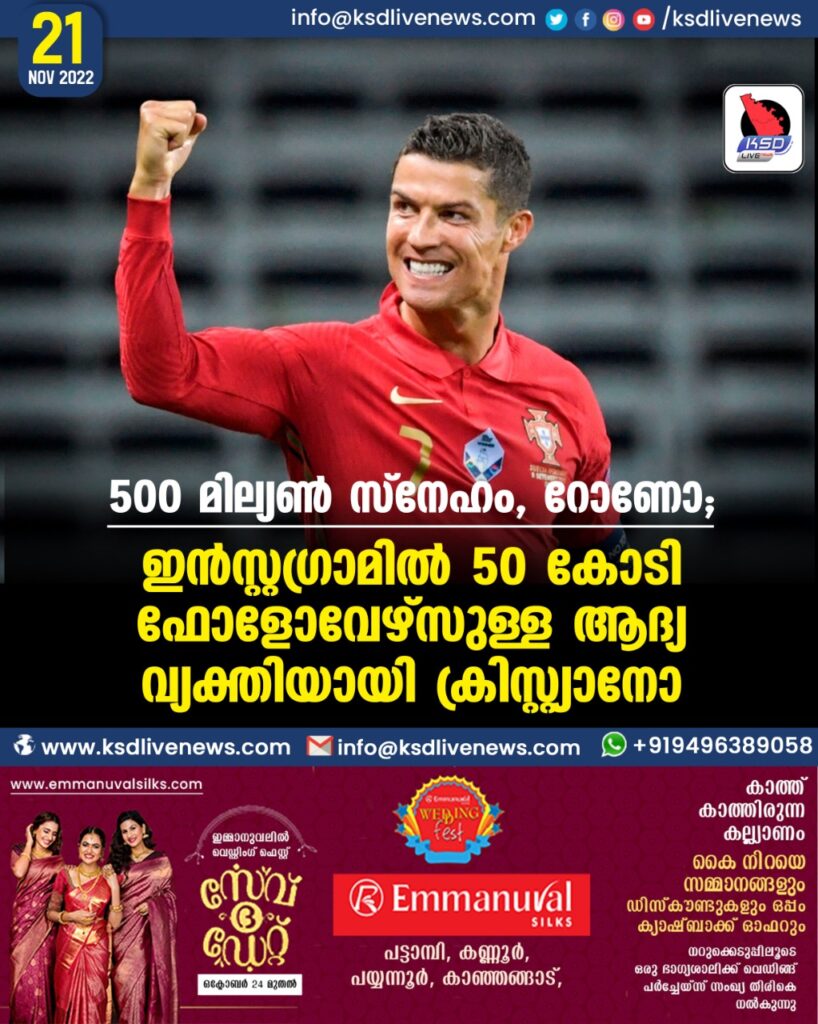500 മില്യണ് സ്നേഹം, റോണോ; ഇന്സ്റ്റഗ്രാമില് 50 കോടി ഫോളോവേഴ്സുള്ള ആദ്യ വ്യക്തിയായി ക്രിസ്റ്റ്യാനോ