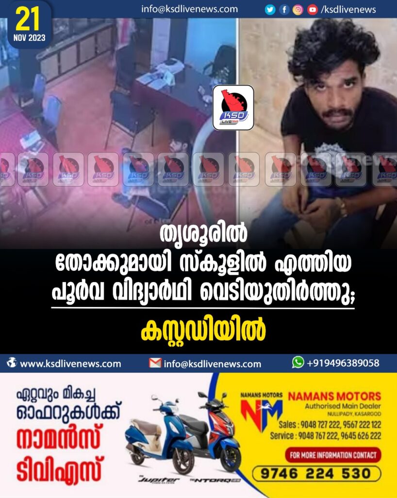തൃശൂരിൽ തോക്കുമായി സ്കൂളിൽ എത്തിയ പൂർവവിദ്യാർഥി വെടിയുതിർത്തു; കസ്റ്റഡിയിൽ – വിഡിയോ