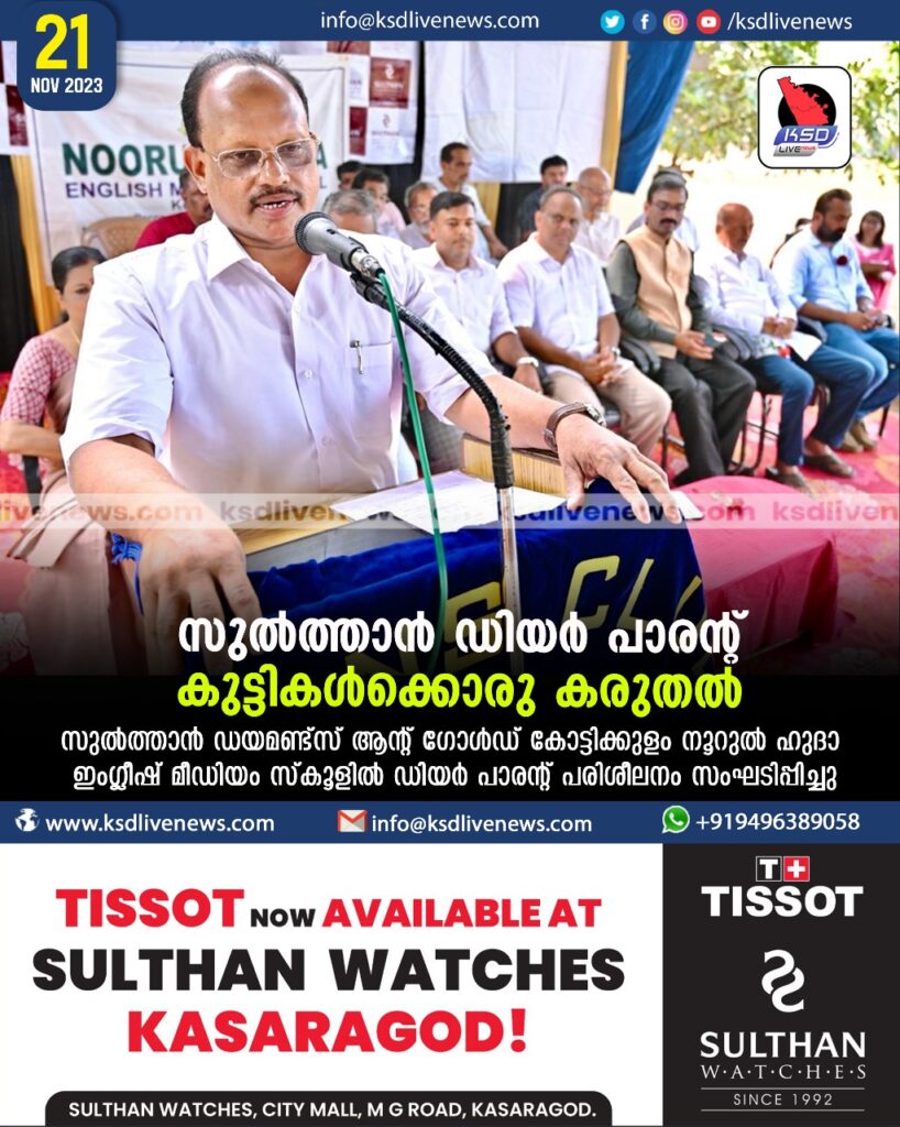 കോട്ടിക്കുളം: സുൽത്താൻ ഡയമണ്ട്സ് ആന്റ് ഗോൾഡ് കോട്ടിക്കുളം നൂറുൽ ഹുദാ ഇംഗ്ലീഷ് മീഡിയം സ്കൂളിൽ ഡിയർ പാരന്റ് പരിശീലനം സംഘടിപ്പിച്ചു. സങ്കീർണമായ ഒരു കാലഘട്ടത്തിലൂടെയാണ് നമ്മൾ കടന്ന് പോകുന്നത് . മയക്ക് മരുന്ന് മാഫിയ , കുട്ടികളുടെ ആത്മഹത്യകൾ , സ്വഭാവ വൈകൃതങ്ങൾ എന്നിവ നമ്മുടെ ഉറക്കം കെടുത്തുന്നു . രക്ഷാകർതൃത്വം ഒരു വെല്ലുവിളിയായ് മാറിയിരിക്കുന്നു. ഈ സാഹചര്യത്തിലാണ് ചൈൽഡ് സൈക്കോളജി , പാരൻ്റിംഗ്, വീടുകളിലെ ആശയ വിനിമയം എന്നീ വിഷയങ്ങൾ ഉൾപ്പെടുത്തി ഡിയർ പാരന്റ് പ്രോഗ്രാം സംഘടിപ്പിക്കുന്നത്. സ്കൂൾ വിദ്യാഭ്യാസ ബോർഡിന്റെയും ചന്ദ്രഗിരി ലയൺസ് ക്ലബ്ബിന്റേയും സഹകരണത്തോടെ സംഘടിപ്പിച്ച പ്രോഗ്രാം കേരള തുറമുഖ മ്യൂസിയം വകുപ്പ് മന്ത്രി അഹമ്മദ് ദേവർ കോവിൽ ഉദ്ഘാടനം ചെയ്തു. ജേസീസ് രാജ്യാന്തര പരിശീലകൻ വി വേണുഗോപാലൻ ക്ലാസ് കൈകാര്യം ചെയ്തു. ബോർഡ് ചെയർമാൻ ഷെരീഫ് കാപ്പിലിന്റെ അധ്യക്ഷതയിൽ ചേർന്ന യോഗത്തിൽ സൂൽത്താൻ കാസറഗോഡ് ബ്രാഞ്ച് ഹെഡ് മുബീൻ ഹൈദർ, മാർക്കറ്റിംഗ് മാനേജർ അബ്ദുൾ മജീദ്, ജമാഅത്ത് പ്രസിഡന്റ് കാപ്പിൽ മുഹമ്മദ് പാഷ, സ്കൂൾ കമ്മിറ്റി മെമ്പർമാരായ ഷാജീസ് ജിന്ന, നൗഷാദ് പളളിക്കുന്ന്, സ്കൂൾ പ്രിൻസിപ്പാൾ ഗീത രാമചന്ദ്രൻ എന്നിവർ സംസാരിച്ചു. ചടങ്ങിൽ മികച്ച രക്ഷിതാക്കൾക്കുള്ള സമ്മാനങ്ങൾ വിതരണം ചെയ്തു.