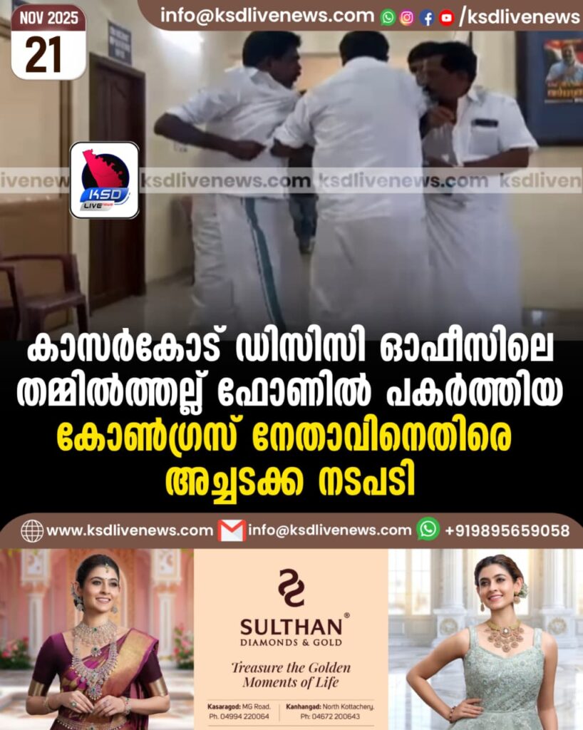 കാസർകോട് ഡിസിസി ഓഫീസിലെ തമ്മിൽത്തല്ല് ഫോണിൽ പകർത്തിയ കോൺഗ്രസ് നേതാവിനെതിരെ അച്ചടക്ക നടപടി