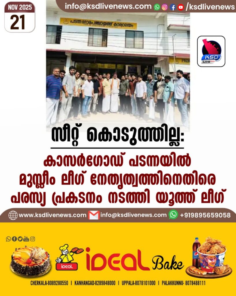 സിറ്റ് കൊടുക്കാത്തതില് പ്രതിഷേധിച്ച് കാസർഗോഡ് പടന്നയില് മുസ്ലീം ലീഗ് നേതൃത്വത്തിനെതിരെ പരസ്യ പ്രകടനം നടത്തി യൂത്ത് ലീഗ്.