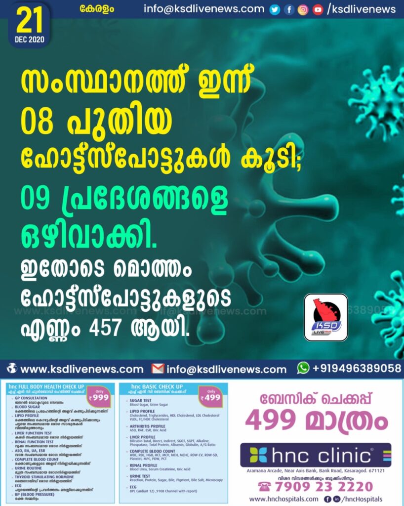 ഇന്ന് 9 പ്രദേശങ്ങളെ ഹോട്ട് സ്പോട്ടില് നിന്നും ഒഴിവാക്കി. ഇതോടെ ആകെ 457 ഹോട്ട് സ്പോട്ടുകളാണുള്ളത്.