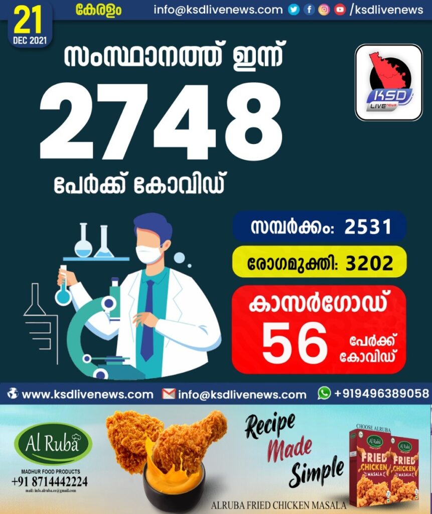 സംസ്ഥാനത്ത് ഇന്ന് 2748 പേർക്ക് കോവിഡ് സ്ഥിരീകരിച്ചു. സമ്പർക്കം വഴി 2531 പേർക്കും ; ആശ്വാസമായി 3202 പേർക്ക് രോഗ മുക്തിയും ; കാസർഗോഡ് ജില്ലയിൽ 56 പേർക്ക് പുതിയ കോവിഡ് കേസുകൾ ; മരണം 33