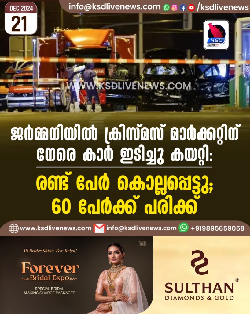 ജര്‍മ്മനിയില്‍ ക്രിസ്മസ് മാര്‍ക്കറ്റിന് നേരെ കാര്‍ ഇടിച്ചു കയറ്റി, രണ്ട് പേര്‍ കൊല്ലപ്പെട്ടു; 60 പേര്‍ക്ക് പരിക്ക്