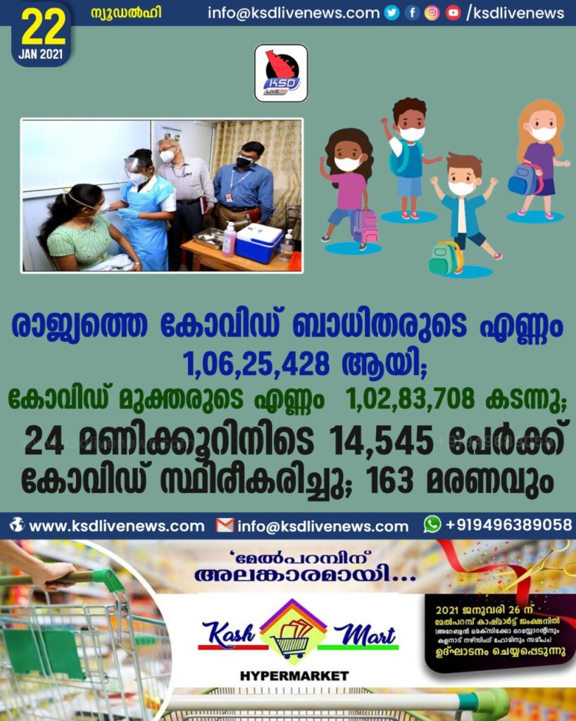 രാജ്യത്തെ കോവിഡ് ബാധിതരുടെ എണ്ണം 1,06,25,428 ആയി ; കോവിഡ് മുക്തരുടെ എണ്ണം 1,02,83,708 കടന്നു ;