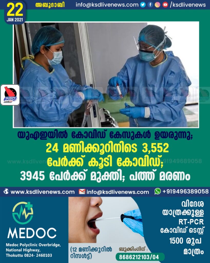 യുഎഇയില് കോവിഡ് കേസുകൾ ഉയരുന്നു; 24 മണിക്കൂറിനിടെ 3,552 പേർക്ക് കൂടി കോവിഡ്; 3945 പേർക്ക് മുക്തി; പത്ത് മരണം..