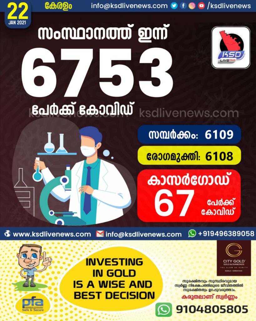സംസ്ഥാനത്ത് ഇന്ന് 6753 പേർക്ക് കോവിഡ് സ്ഥിരീകരിച്ചു. സമ്പർക്കം വഴി 6109 പേർക്കും ; ആശ്വാസമായി 6108 പേർക്ക് രോഗ മുക്തിയും ; കാസർഗോഡ് ജില്ലയിൽ 67 പേർക്ക് പുതിയ കോവിഡ് കേസുകൾ ; മരണം 19