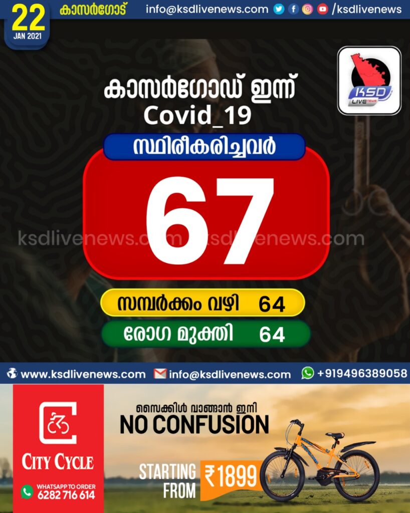 കാസര്കോട് ജില്ലയില് 67 പേര്ക്ക് കോവിഡ്, 64 പേര്ക്ക് രോഗമുക്തി