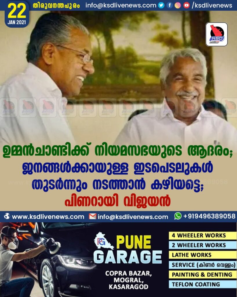 ഉമ്മൻ ചാണ്ടിക്ക് നിയമസഭയുടെ ആദരം ; ജനങ്ങൾക്കായുള്ള ഇടപെടലുകൾ തുടർന്നും നടത്താൻ കഴിയട്ടെ -പിണറായി വിജയൻ