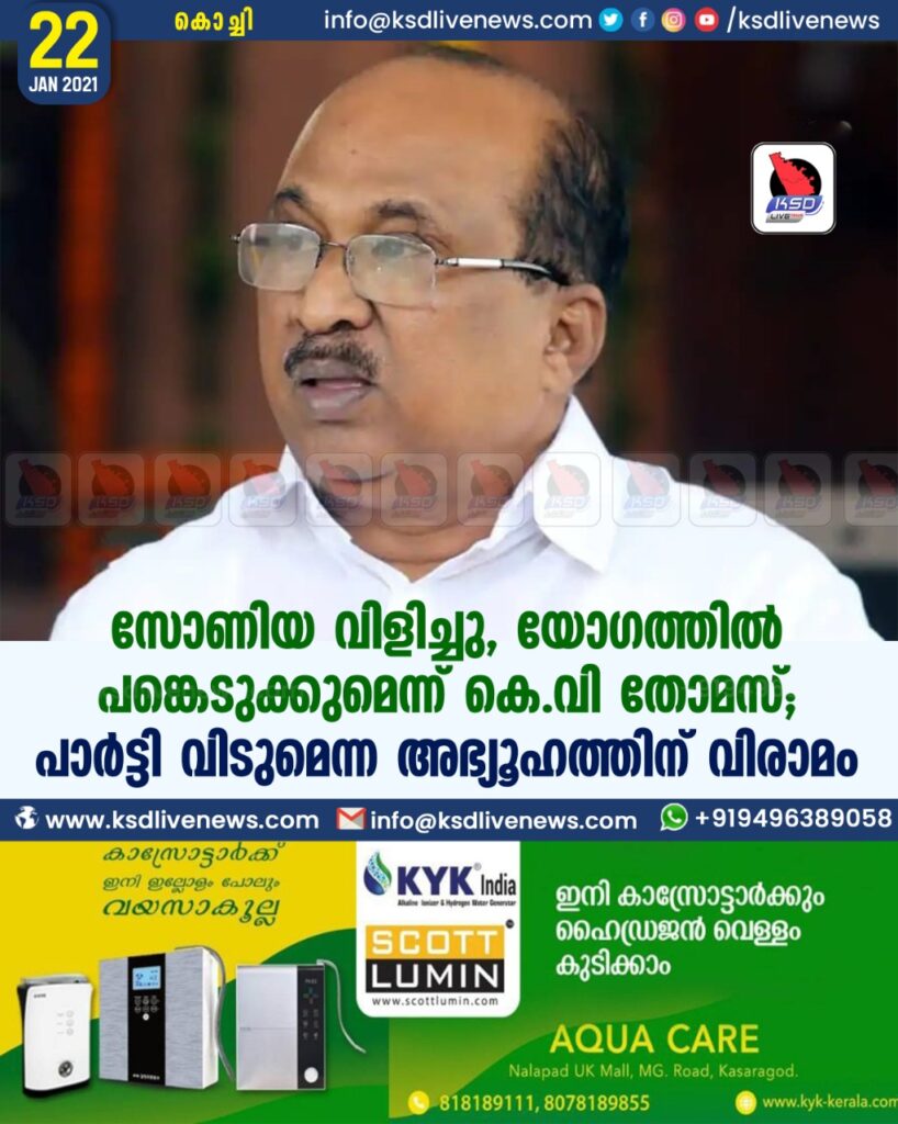സോണിയ വിളിച്ചു, യോഗത്തില്‍ പങ്കെടുക്കുമെന്ന് കെ.വി തോമസ്; പാര്‍ട്ടി വിടുമെന്ന അഭ്യൂഹത്തിന് വിരാമം