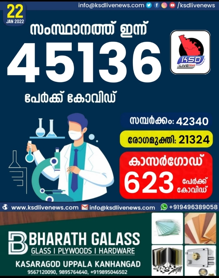 കോവിഡിൽ വിറച്ച് കേരളം; സ്ഥാനത്ത് ഇന്ന് 45136 കോവിഡ് സ്ഥിരീകരിച്ചു. സമ്പർക്കം വഴി 42340 പേർക്കും ; ആശ്വാസമായി 21324 പേർക്ക് രോഗമുക്തി ; കാസർഗോഡ് ജില്ലയിൽ 623 പേർക്ക് പുതിയ കോവിഡ് കേസുകൾ ; മരണം 70