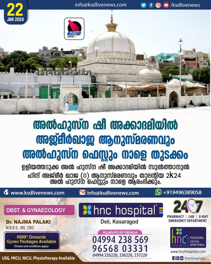കാസർകോട്: ഉളിയത്തടുക്ക അൽ ഹുസ്ന ഷീ അക്കാദമിയിൽ സുൽത്താനുൽ ഹിന്ദ് അജ്മീർ ഖാജ (റ) ആണ്ടനുസ്മരണവും താലന്റിയ 2k24 അൽ ഹുസ്ന ഫെസ്റ്റും നാളെ ആരംഭിക്കും.