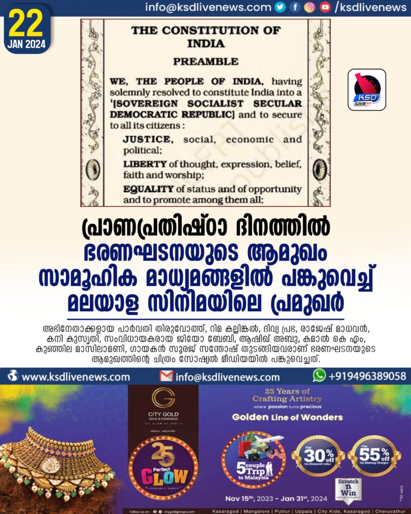 പ്രാണപ്രതിഷ്ഠാ ദിനത്തില് ഭരണഘടനയുടെ ആമുഖം സാമൂഹിക മാധ്യമങ്ങളില് പങ്കുവെച്ച് മലയാള സിനിമയിലെ പ്രമുഖര്